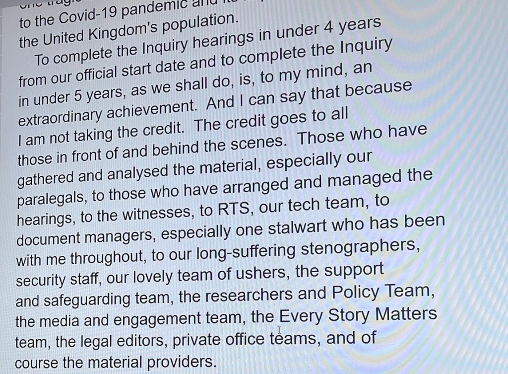 Yesterday, then, was the final day of the public hearings. A day of reflection and a little sadness – but also a big sense of a job well done by everyone involved. For me, a little moment of pride when dear Claire Mitchell KC name-checked me in her words of thanks on behalf of Scottish Covid Bereaved.